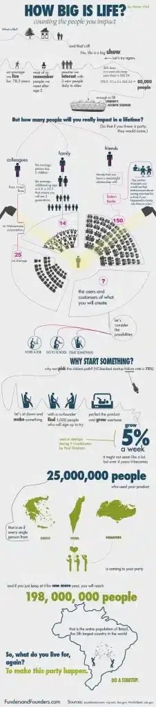 L’infografica “How Big is Life? Counting the People You Impact” di Anna Vital, oltre a indicare quante persone incontreremo in media nella nostra vita presenta un’interessante riflessione sul numero di persone che un individuo può influenzare nel corso della sua vita.