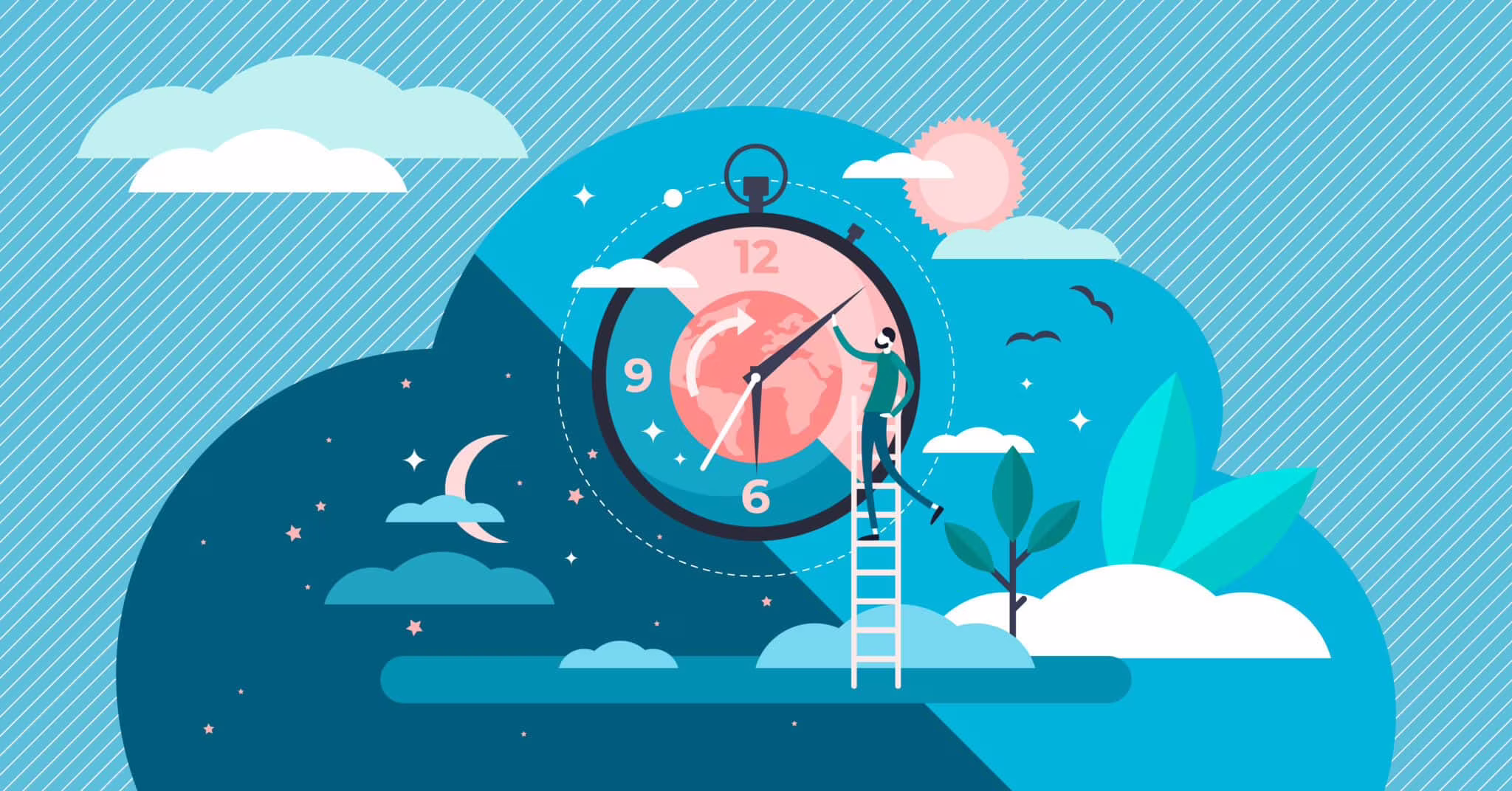 Daytime cycle tiny person flat vector illustration. Natural planet movement around the sun. Daily morning till evening routine. Healthy human Circadian sleep rhythm system. Earth science and astrology