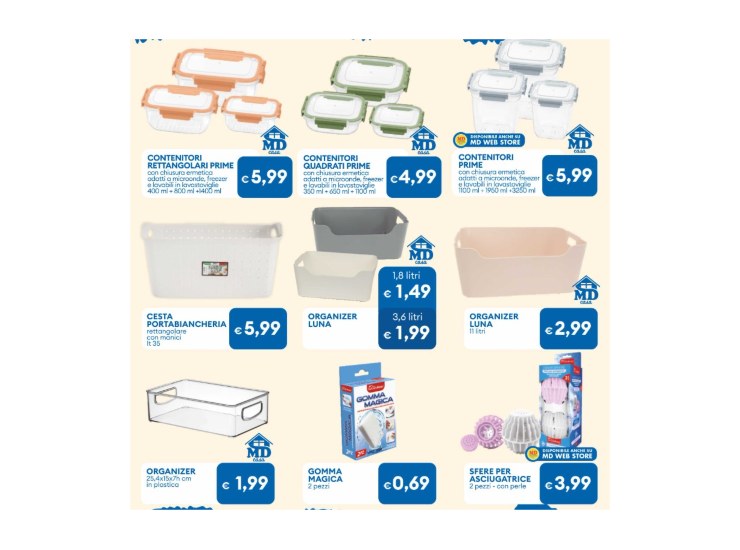 Dal 23 settembre al 5 ottobre il volantino mette in evidenza una serie di prodotti per la casa che fanno davvero gola. Ad esempio ci sono i contenitori rettangolari Prime con chiusura ermetica, perfetti per microonde, freezer e pure lavastoviglie: un set da 400, 800 e 1400 ml costa 5,99 €, e lo stesso prezzo vale per il kit più grande da 1100, 1950 e 3250 ml.