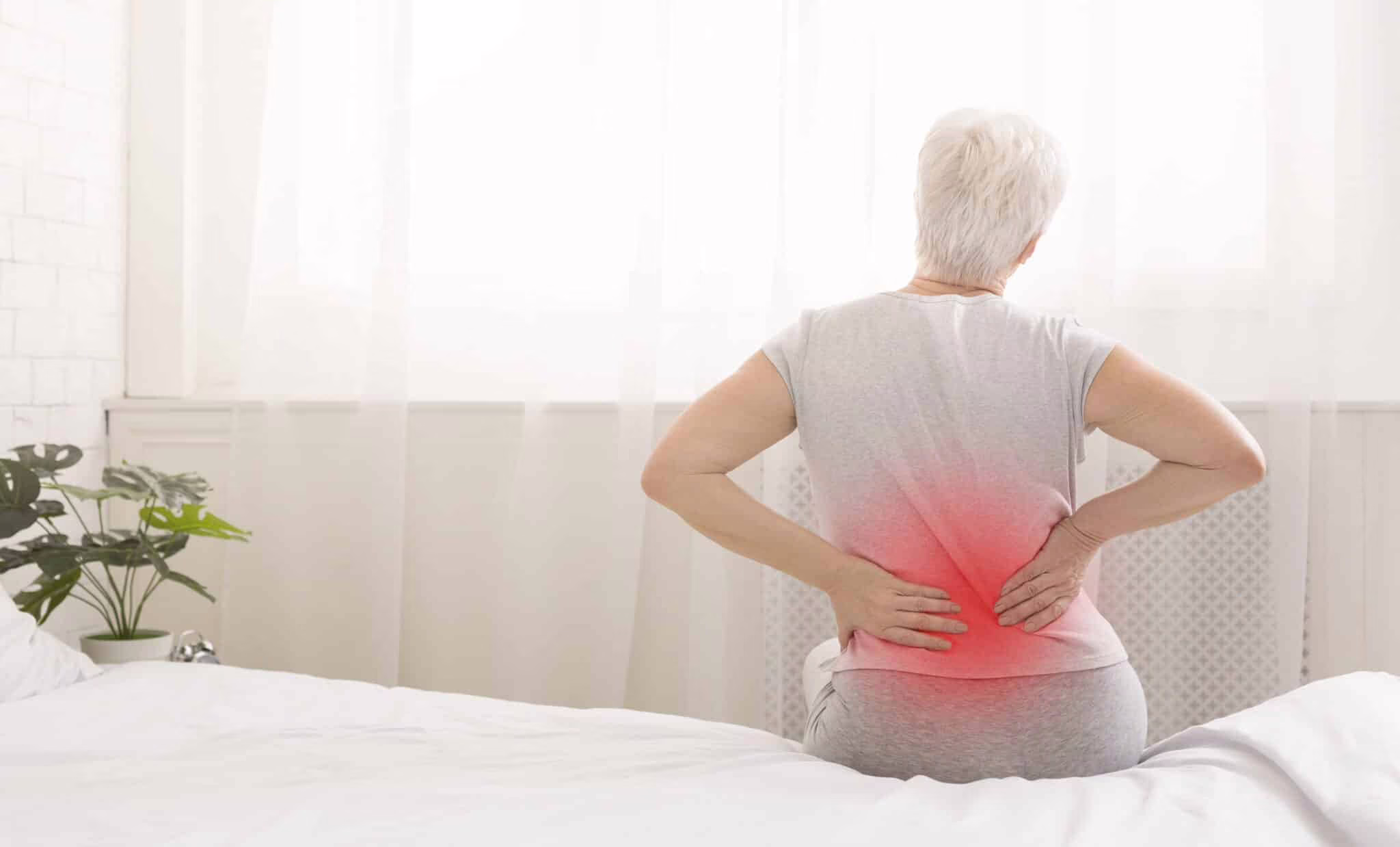 Senior woman suffering from backache in morning sitting on bed, red sore zone, panorama with free space