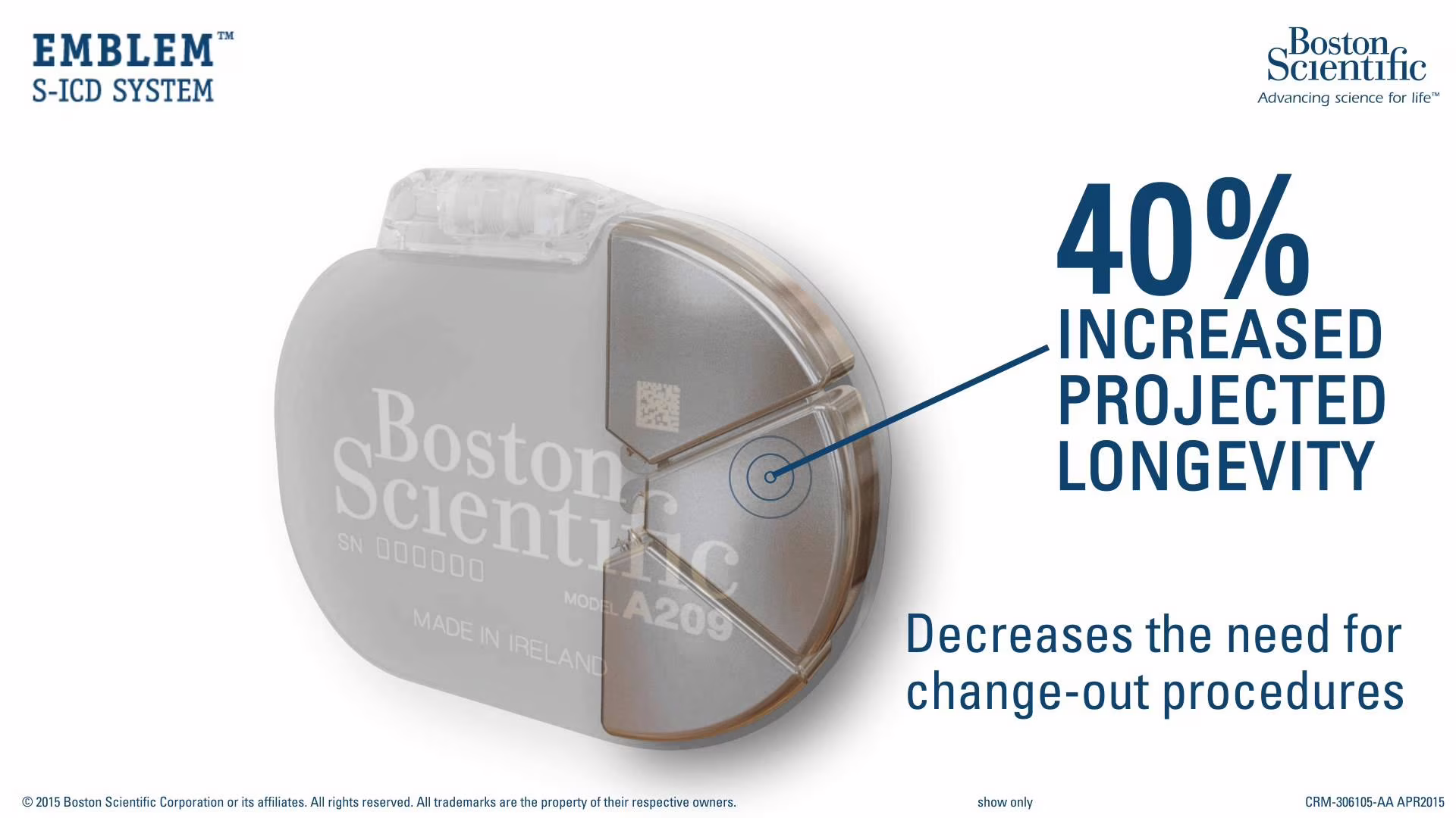 Si tratta di cifre estremamente considerevoli, che la Boston Scientific vuol contribuire ad elidere con Emblem S-ICD, seconda generazione di defibrillatori sottocutanei, capaci di monitorare perennemente il ritmo cardiaco e controllare eventuali tachiaritmie ventricolari potenzialmente letali, tramite una piccola scarica elettrica utile a regolare il ritmo e ripristinare la normale circolazione sanguigna. Una seconda generazione che lascia trasparire quanto sia stato fatto, in pochi anni, in termini di evoluzione tecnologica, di efficacia e sicurezza, di attenzione e sensibilità clinica.