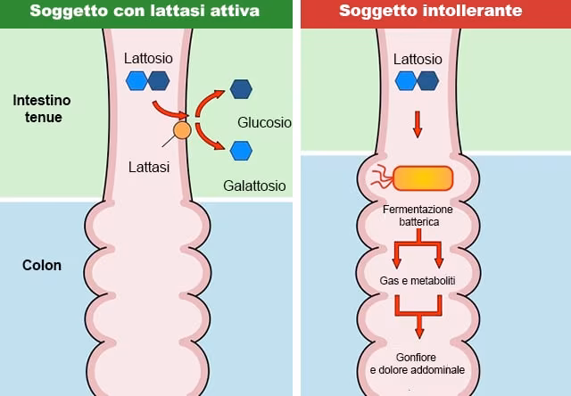 L’insorgenza di questi sintomi è data dal passaggio del lattosio non digerito attraverso l’intestino tenue, dove richiama acqua che sarà poi responsabile della comparsa di diarrea ed in seguito, raggiungendo l’intestino crasso subirà il processo di fermentazione a carico della flora batterica intestinale con conseguente produzione di gas intestinali e acidi organici.