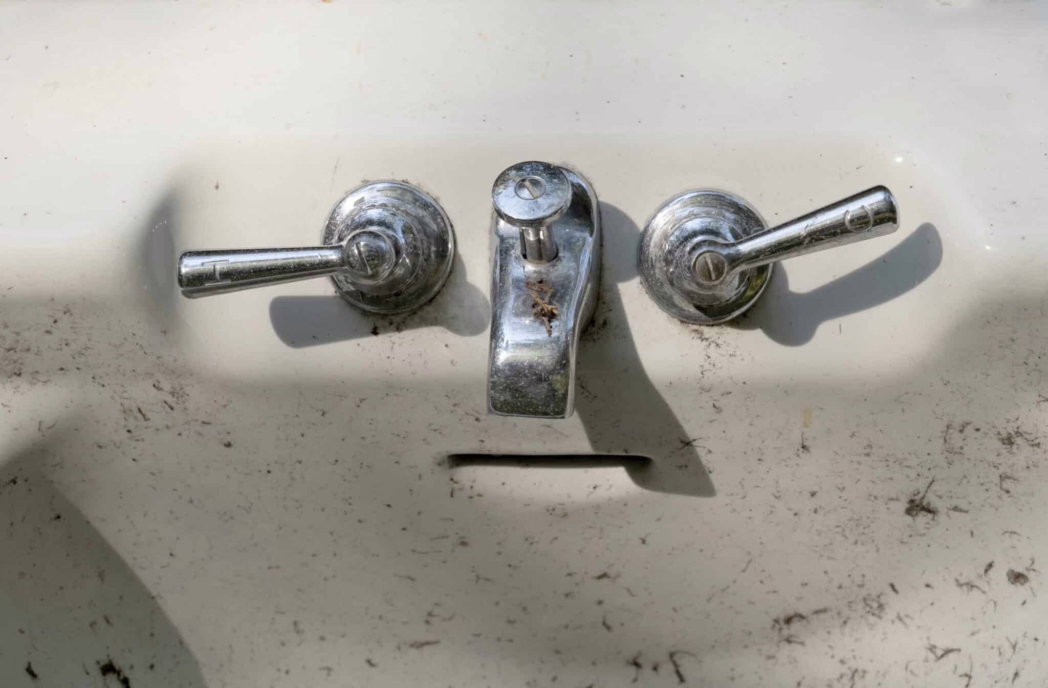old dirty porcelain bathtub appears to have a face, with the handles being eyes, the faucet a nose and the over flow slit a mouth