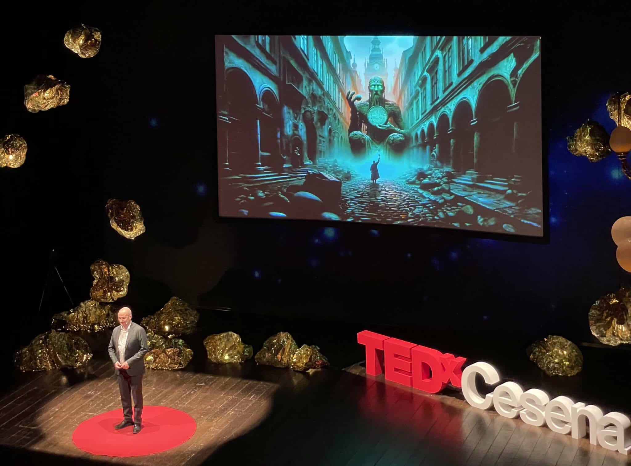 Una delle novità più affascinanti del TEDxCesena 2023 è stato il contributo di BrainArt. Già noto nel panorama TEDx per il suo intervento nel 2021 e la partnership tecnica nel 2019, BrainArt ha raggiunto nuovi livelli di innovazione in questa edizione. Grazie al coinvolgimento di Maurizio Berti, curatore e organizzatore principale, BrainArt ha sperimentato un approccio unico: combinando intelligenza artificiale e analisi del sentiment dello speech di ogni oratore, è stato possibile creare immagini che catturavano l’essenza dei loro discorsi. Questo processo ha trasformato le parole in colori, stili e complessità visiva, creando un ponte tra la dimensione verbale e quella visiva.