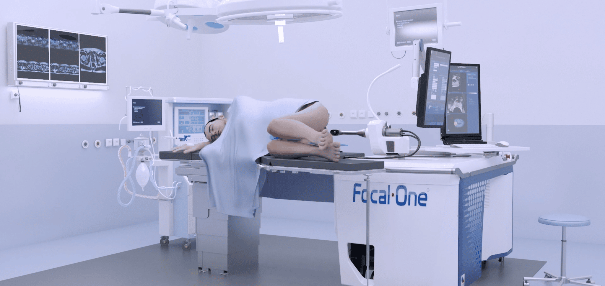 Il cancro alla prostata è trattato con Focal One® mediante la creazione di una coagulazione precisa e irreversibile del tessuto mirato, preservando il tessuto circostante. Cioè, attraverso il retto, si emettono ultrasuoni ad alta frequenza nel punto di interesse, aumentando la temperatura a 85 °C: ciò causa la necrosi del tessuto mirato. È una combinazione ottimale di tecnologia con movimenti robotici ben definiti. Il chirurgo mantiene il controllo del trattamento sia in fase di esecuzione sia di programmazione, l’apparecchio robotizzato riduce i rischi di complicanze procedurali e l’anatomia del paziente che si modifica.