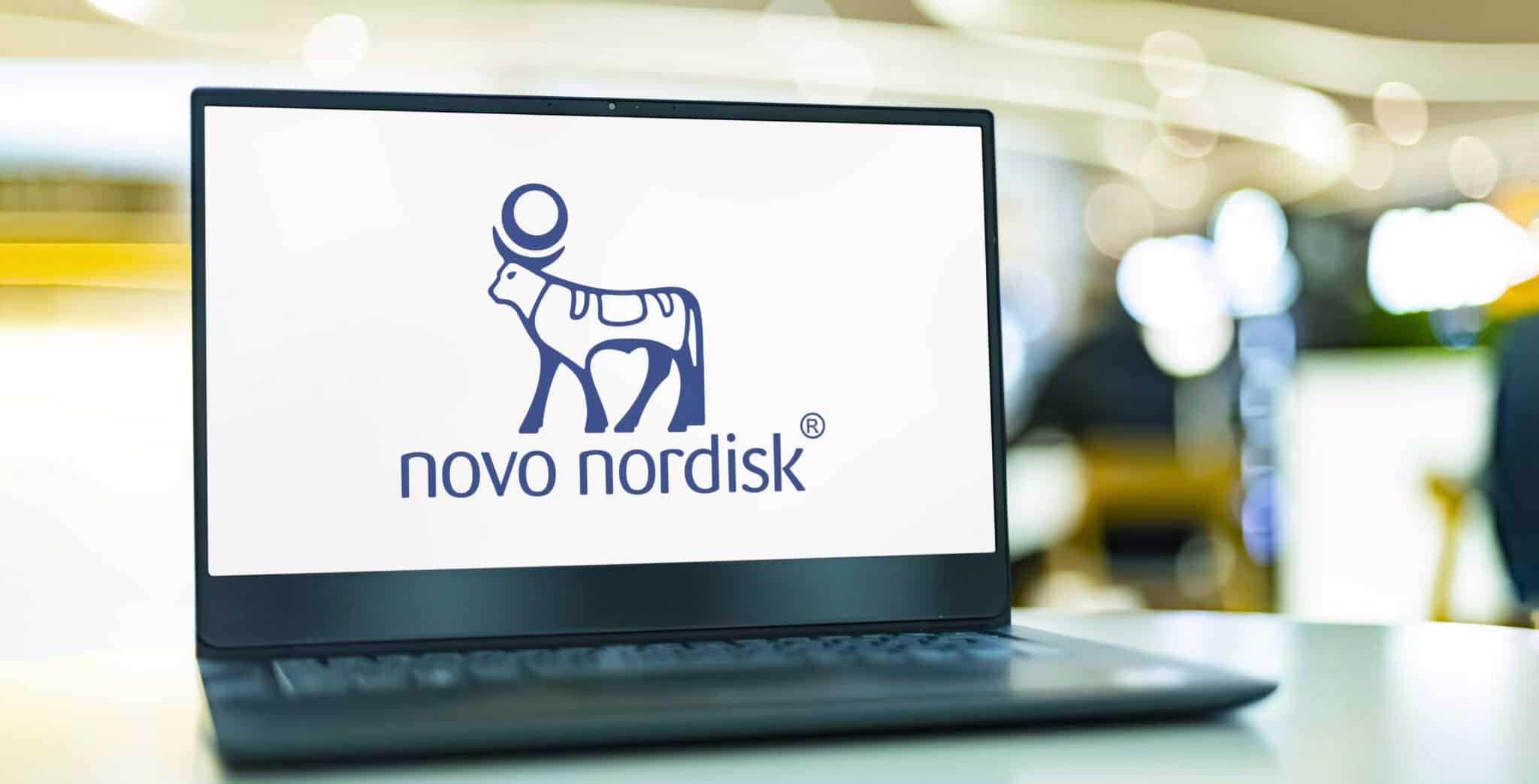 POZNAN, POL - OCT 28, 2022: Laptop computer displaying logo of Novo Nordisk, a multinational pharmaceutical company headquartered in Bagsvard, Denmark